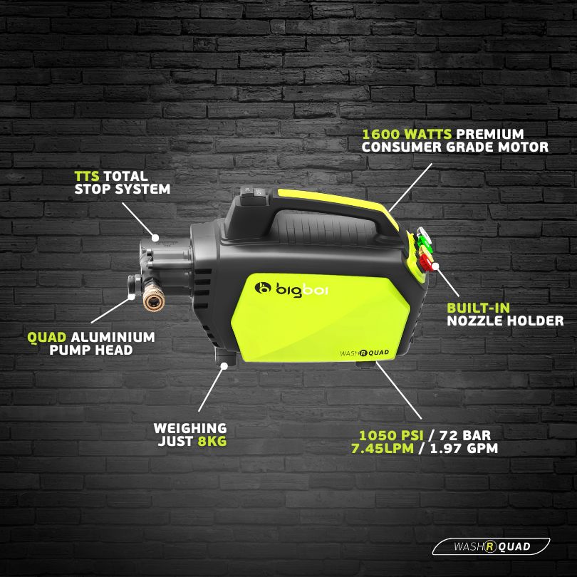 Introducing the new bigboi WashR QUAD, a premium consumer-grade pressure washer designed for car care enthusiasts who demand performance and reliability. Engineered with bigboi’s exclusive quad pump design, this compact yet powerful unit delivers a perfect balance of pressure and water flow, every time.